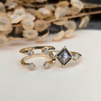 14-karat recycled yellow gold, 1.12 carat kite-shaped salt + pepper diamond, 2-2.5, 4-2mm SI1-G round brilliant diamonds. The total carat weight for this set is 1.36 carats.