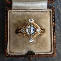 14-karat recycled yellow gold, 1.5ct light salt + pepper hexagon-shaped diamond, 4-2.5mm SI1-G white round brilliant diamonds (0.24cts). Total carat weight for this set is 1.74cts.