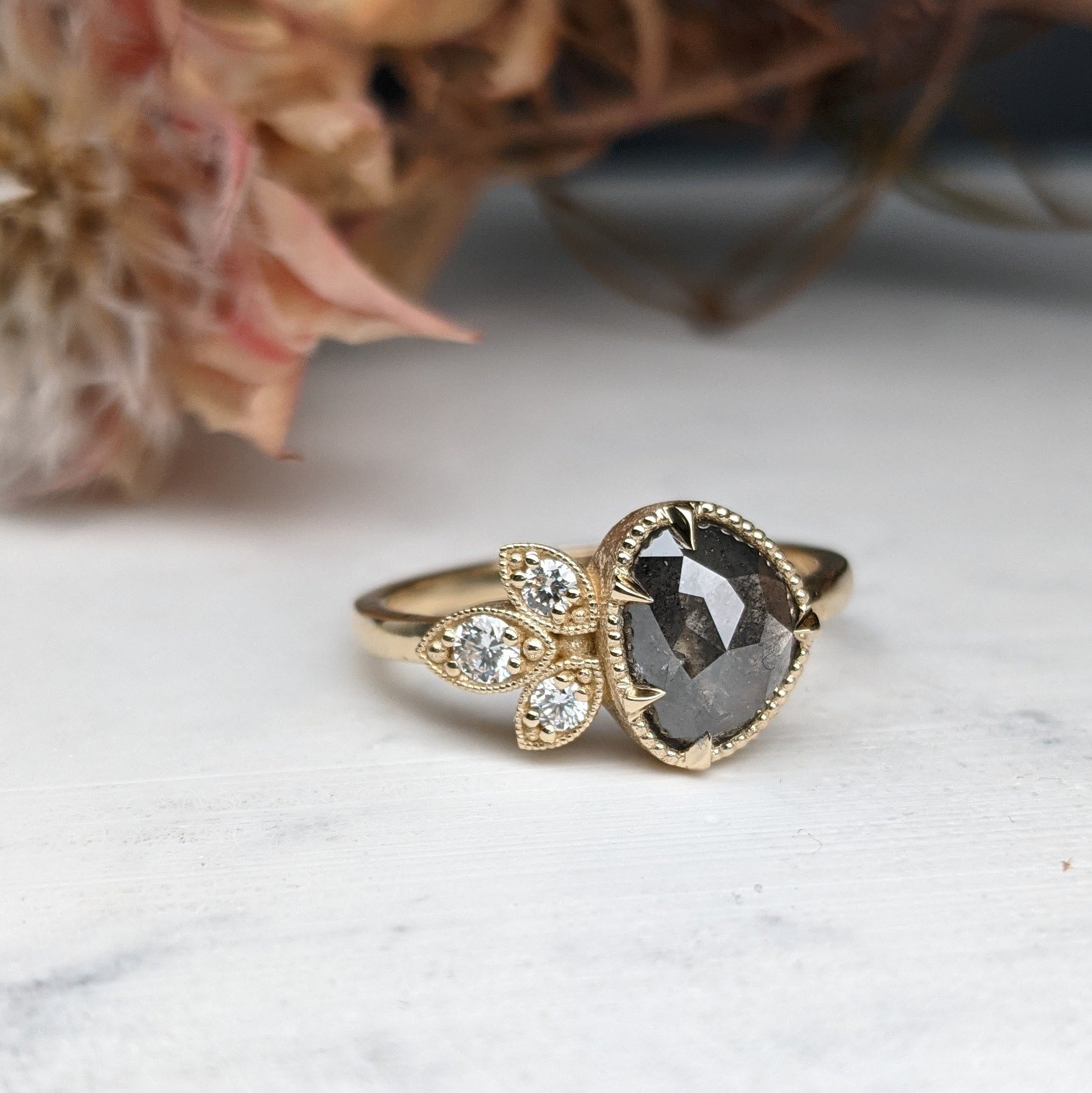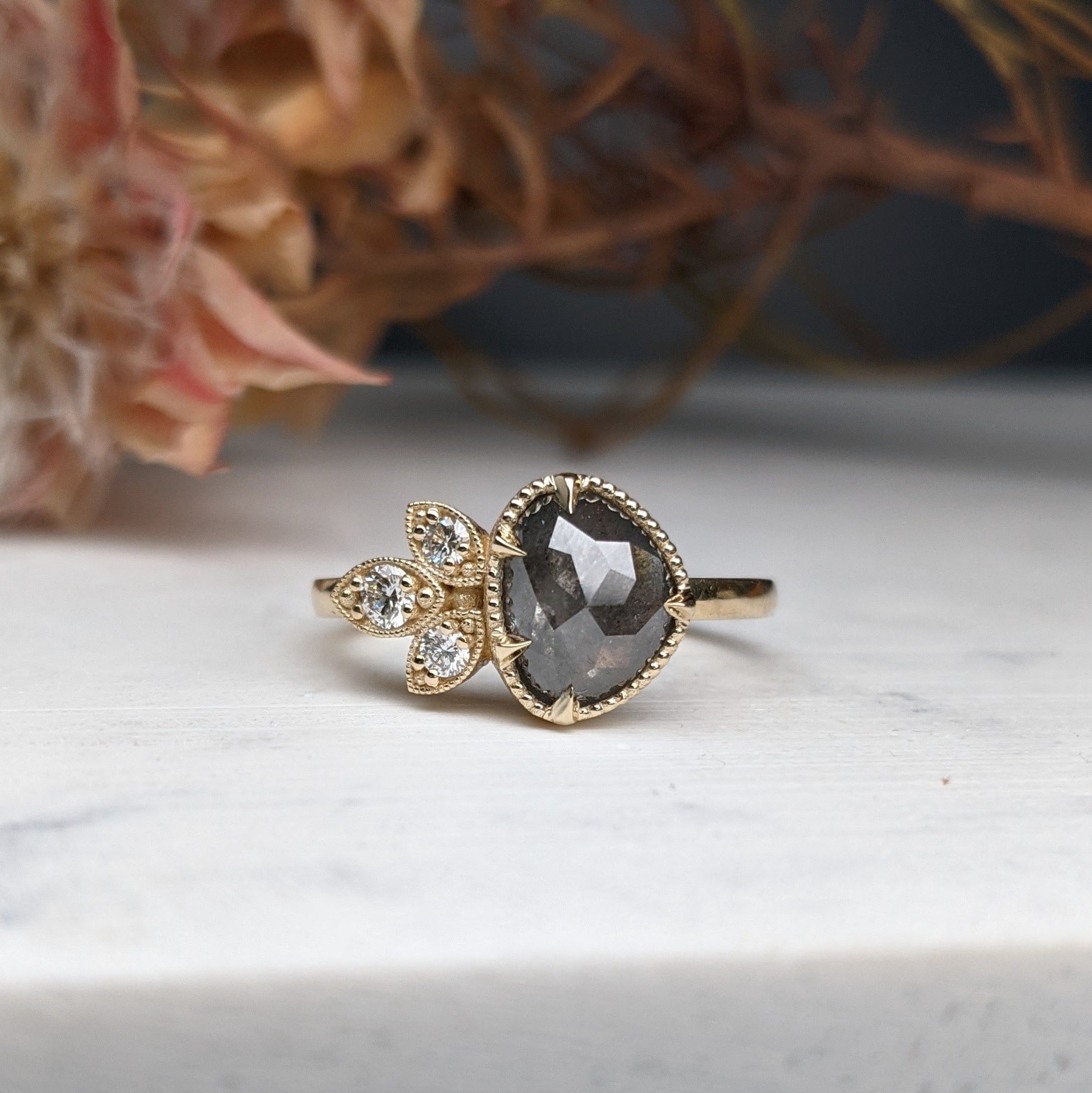 14-karat recycled yellow gold, 1.38 salt + pepper diamond, 1-2.5mm, 2-2mm SI1-G round brilliant diamonds. The total carat weight for this ring is 1.5 carats.
