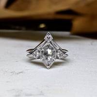 14-karat recycled white gold, 0.95 carat pear-shaped salt + pepper diamond, 3-2.5mm SI1-G white round brilliant diamonds (0.18ctw). Total carat weight for this set is 1.13 carats.