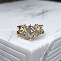 14-karat recycled yellow gold, 1.75ct icy kite-shaped diamond, 6-2.5mm white round brilliant diamonds (SI1-G) 0.36ctw. Total carat weight for this ring is 2.11cts