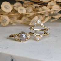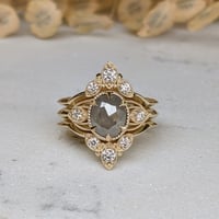 14-karat recycled yellow gold, 2.06 ct. oval grey diamond, 2- 2.5mm, 6- 2mm SI1-G white round brilliant diamonds. The total carat weight for this ring set is 2.36 carats.