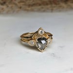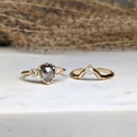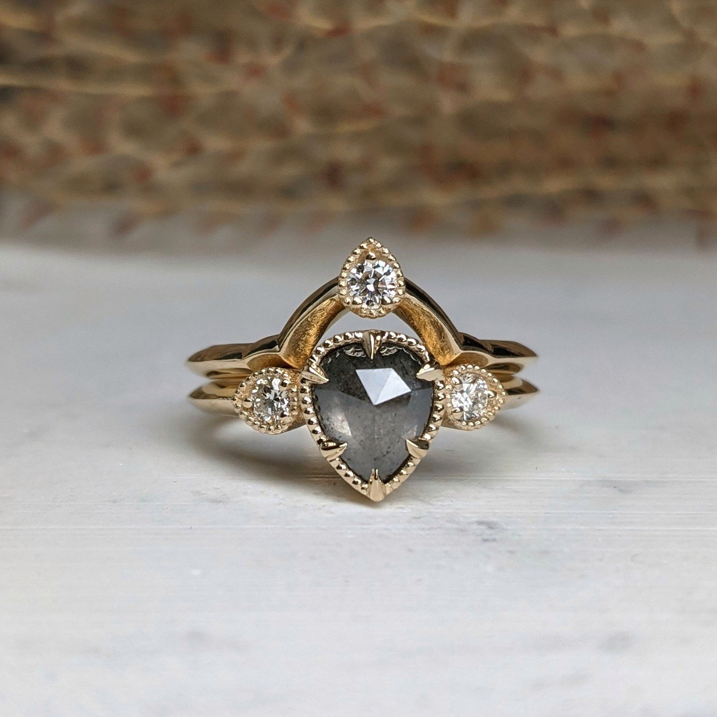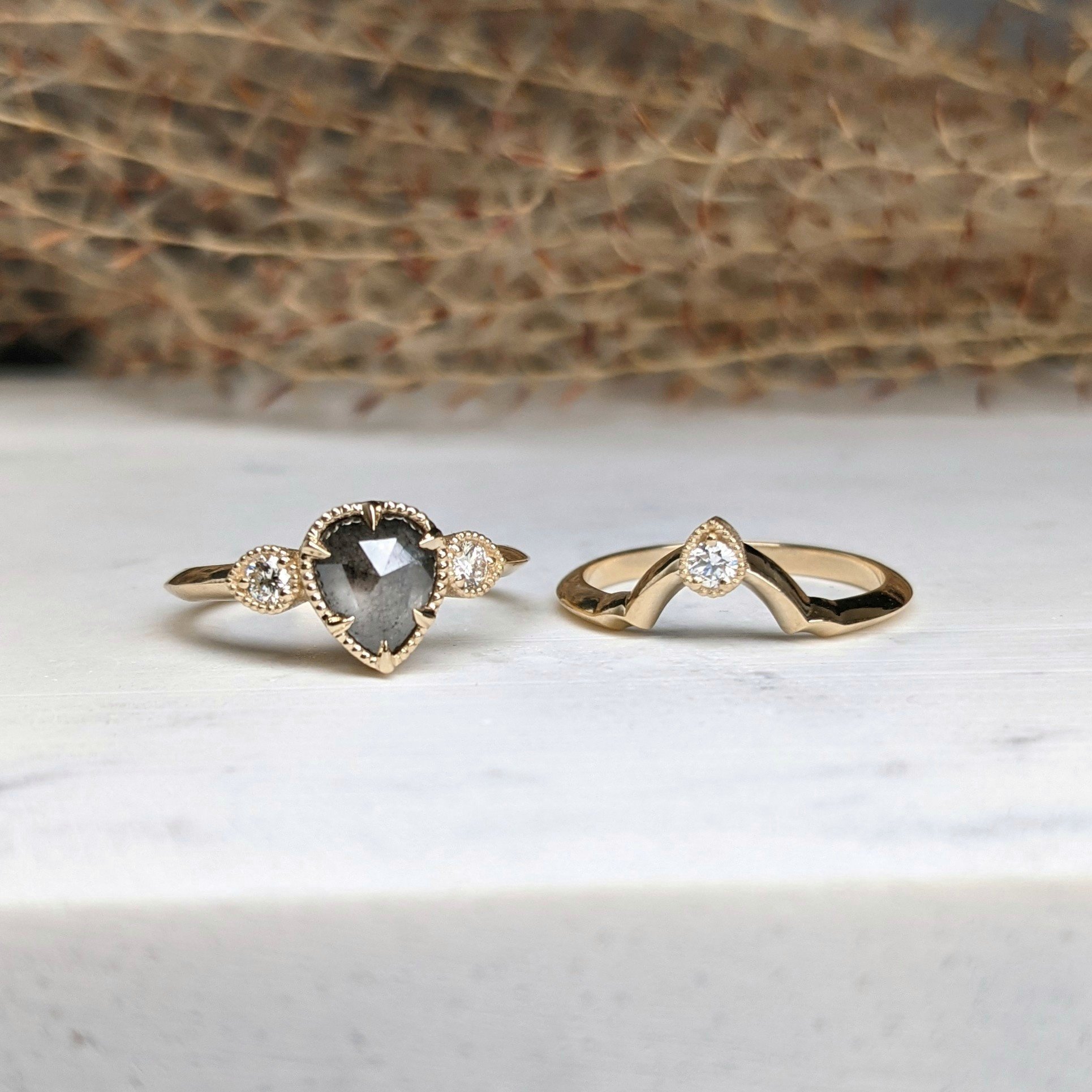 14-karat recycled yellow gold, 1.23 carat pear-shaped salt + pepper diamond, 3-2.5mm SI1-G white round brilliant diamonds. The total carat weight for this ring set is 1.41 carats.